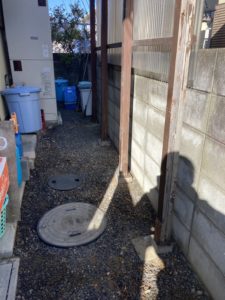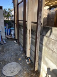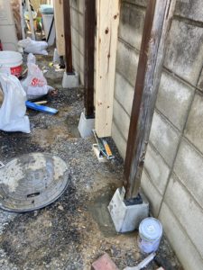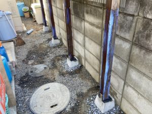 柱(木材)の下の部分が雨や経年劣化で腐ってきており、地震や台風の影響で倒壊を防ぐために