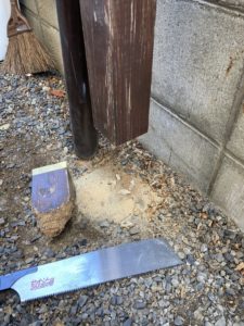 ※のこぎりでカットするライン(束石と接地するライン)について、本来はジャッキアップする前と、した後の高低差を視覚的に把握するため杭を打ち、水糸(たこ糸のようなもの)を張るのですが、今回は柱の後ろにブロック塀がありましたので、ブロック塀に墨出し施工いたしました。